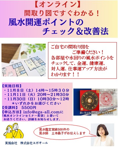*お申込み HP 申し込みフォーム に必要事項を、内容欄に「10月18日 風水セミナー希望」とご記入ください。