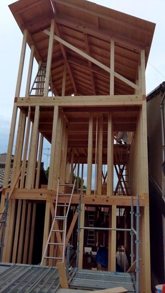 決して広くない敷地。住みやすい面積を保った居住スペースにするためには3階建てに。どの方位を座向(物件の入り口方位と後方方位)に取るかは風水施工の大きな軸となります。